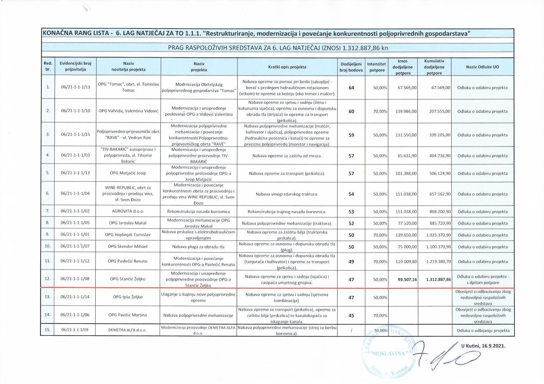 6. LAG Natječaja za TO 1.1.1.”Restrukturiranje, modernizacija i povećanje konkurentnosti poljoprivrednih gospodarstava”